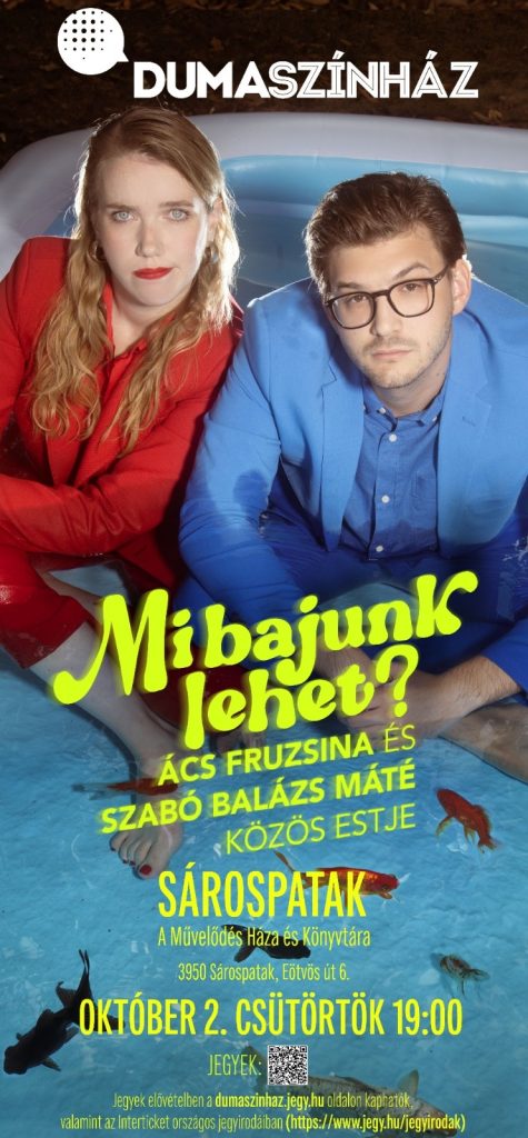 Október 2-án 19 órakor Ács Fruzsina és Szabó Balázs Máté közös estje “Mi bajunk lehet?” címmel Sárospatakon, A Művelődés Háza és Könyvtárában!