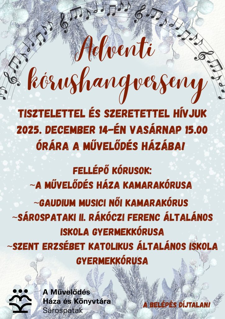 Szeretettel hívunk mindenkit advent harmadik vasárnapján, 2025. december 14-én, 15:00 órára a Művelődés Házába egy ünnepi, lélekemelő kórushangversenyre.