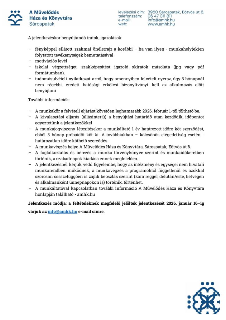 Jelentkezni fényképes önéletrajz beküldésével: info@amhk.hu e-mail címre.